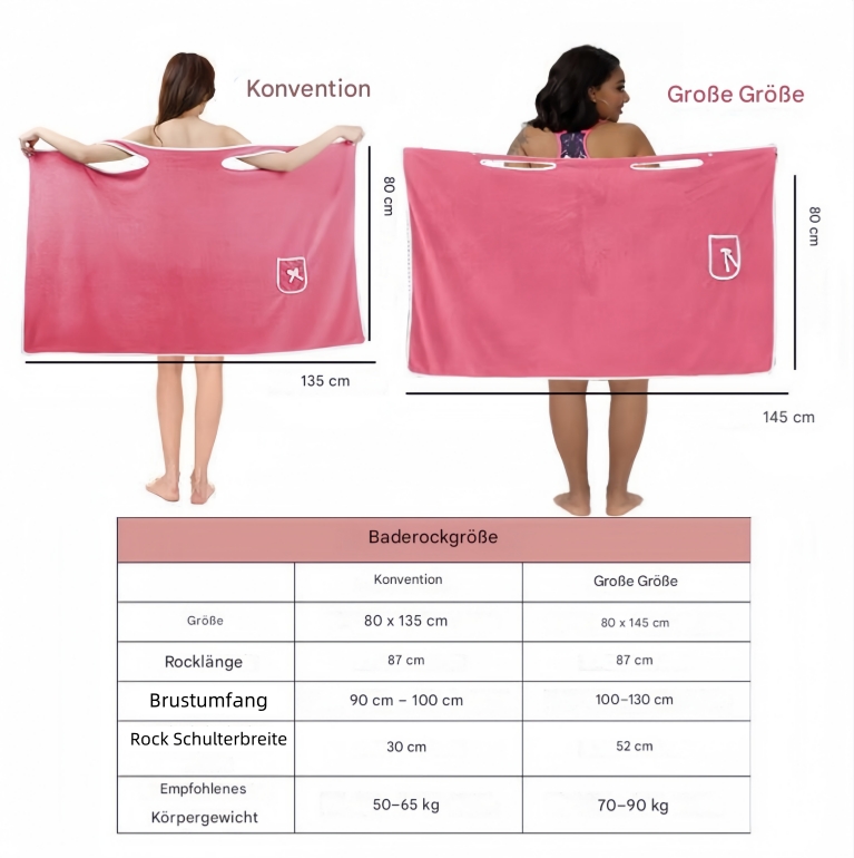 Gönnen Sie sich den ultimativen Komfort mit unserem Badetuch für Damen aus superweichem und hautfreundlichem Korallenfleece. Das Material zeichnet sich nicht nur durch eine hervorragende Wasseraufnahme und schnelle Trocknung aus, sondern sorgt auch für ein atmungsaktives, warmes und gemütliches Tragegefühl.