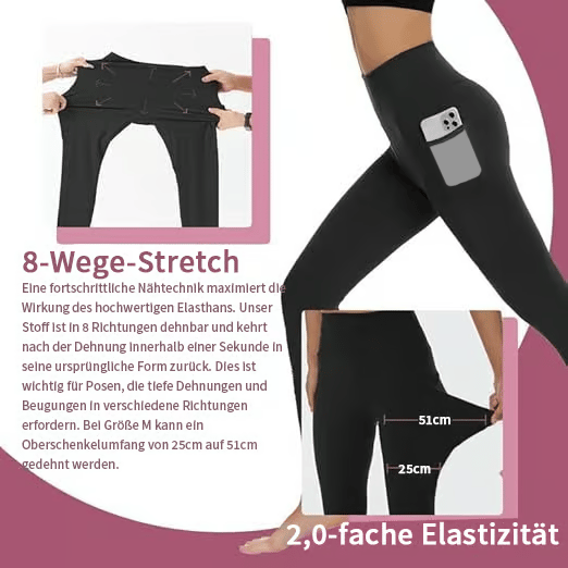 Eine neue Möglichkeit zur Formgebung: hohe Taille und Bauchstraffung, Seitentaschen-Design für mehr Bewegungsfreiheit.