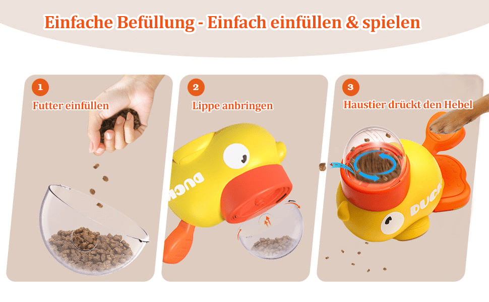 1. Gießen Sie in Tiernahrung, 2. installieren Sie den Deckel, 3.Pet drückt den Griff