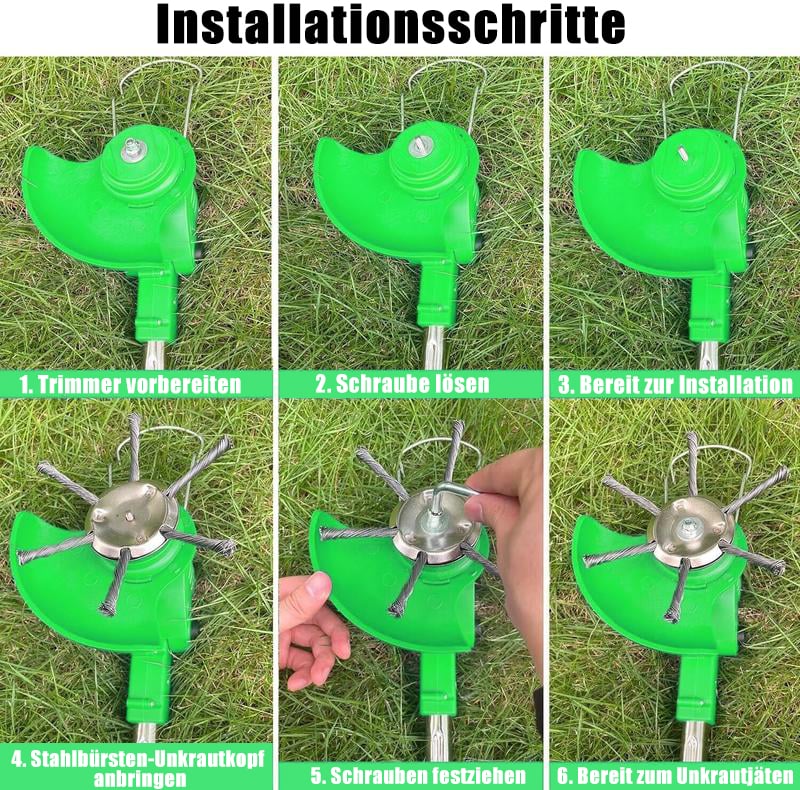 Der Trimmerkopf mit Stahldrahtklinge kann zum Rasenmähen verwendet werden, insbesondere zum Entfernen von Unkraut in Ecken oder zwischen Ziegeln, zum Reinigen von Moos auf Gehwegen und zum Entfernen von Unkraut auf Sand und Kies. Kann zum Entfernen von Rost, Moos, zum Reinigen von Böden, zum Bürsten von Unkraut in Gärten, auf Gehwegen, in Innenhöfen, auf Parkplätzen usw. verwendet werden.